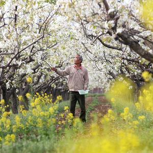 4月12日,農民在河北省張家口市懷來縣官廳鎮石片村杏花園里進行管護。