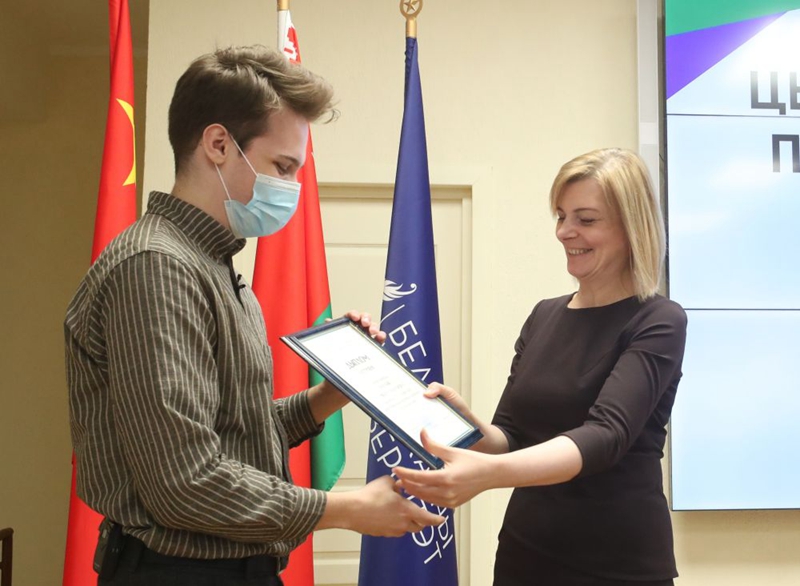 2021年3月5日,白俄羅斯教育部第一副部長斯塔羅沃伊托娃(右)在明斯克向第四屆白俄羅斯大學生奧林匹克中文競賽第一名獲得者頒發證書。新華社發(任科夫攝)