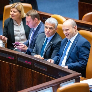 6月30日,在位于耶路撒冷的以色列議會,貝內特(前右二)和拉皮德(前右一)參加議會全會。新華社/基尼圖片社