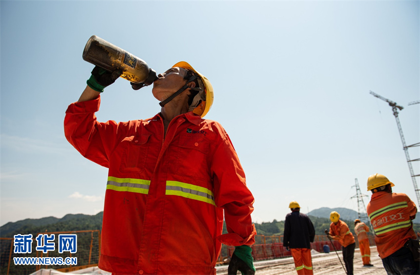 在景文高速控制性工程高嶺頭水庫特大橋施工現場,“到中午時,在大橋上面沒有遮擋,氣溫達到40攝氏度以上。但不管有多苦多累,我們都要保質保量,爭取早日把這項目建成。”澆筑工人范祠榮說。為了預防中暑,工人們的訣竅就是多喝水,他們每個人每天帶著兩公升的水壺,每天要喝兩三壺。