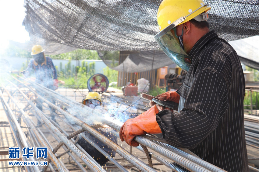 在義東高速1標白云互通施工現場,30多名班組工人開展支架搭設、鋼筋綁扎、焊接等工作。“最近實在太熱了,我們就把(每天的)工作時間提前了。”鋼筋工何桂美一邊綁鋼筋,一邊說,綁扎鋼筋是在給后續混凝土澆筑工作做鋪墊,必須要快,但這樣的大熱天,確實戴著手套都燙手,不過為了工作,大家都習慣了。因為暴露在太陽下工作,何桂美臉頰已被炙烤得通紅。