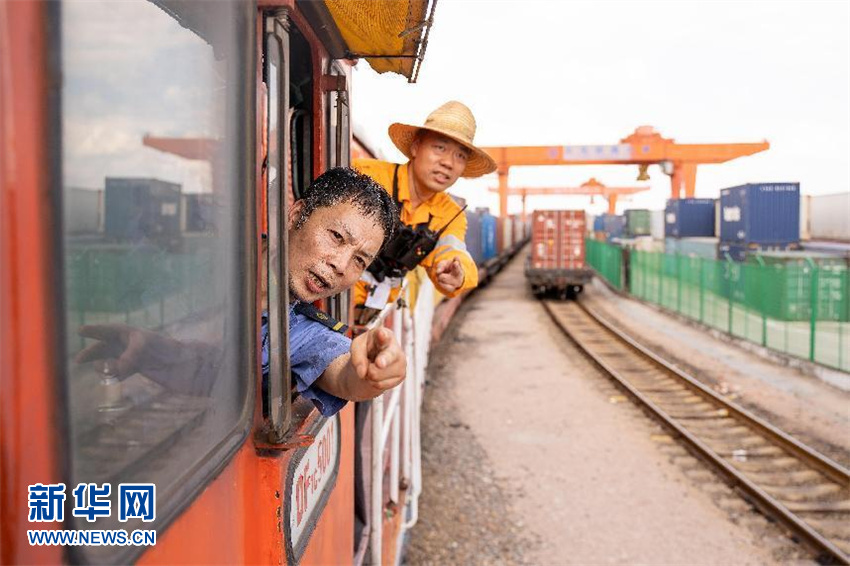 氣溫持續攀升,中歐班列熱度不減。“拼裝師”們每天跟著火車跑來跑去,在車廂爬上爬下,保障“絲綢之路經濟帶”的大動脈車輪永不停歇。義烏西站13道線上,穿著長袖工裝、頭戴草帽、身背安全帶,全副武裝的調車長蔣誠陽配合司機,解編需要送去“拼裝”的貨車車輛。調車司機在蔣誠陽的配合下緩緩推進,甩掛連接精準到位,緊接著檢查、試拉、接風管、撤木鞋、松手閘等步驟一氣呵成,需要“拼裝”的車輛被緩緩拉走。