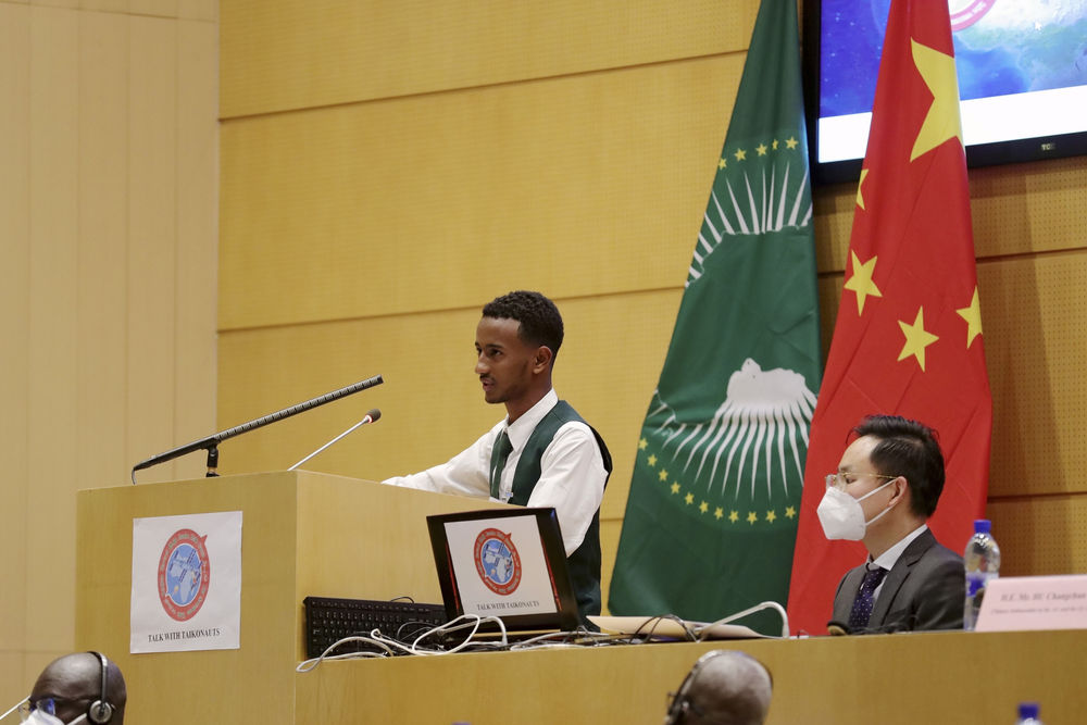 ↑9月6日,在位于埃塞俄比亞亞的斯亞貝巴的非盟總部,一名埃塞俄比亞中學(xué)生在“天宮對(duì)話”活動(dòng)中向中國(guó)航天員提問(wèn)。新華社發(fā)(邁克爾·特韋爾德攝)