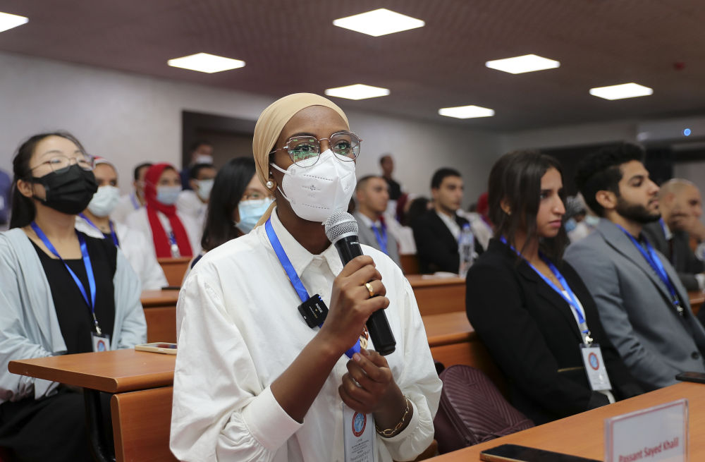 ↑9月6日,在埃及開羅的“天宮對(duì)話”活動(dòng)埃及分會(huì)場(chǎng),一名開羅大學(xué)青年漢語(yǔ)老師向中國(guó)首位女航天員劉洋提問(wèn)。新華社記者 王東震 攝