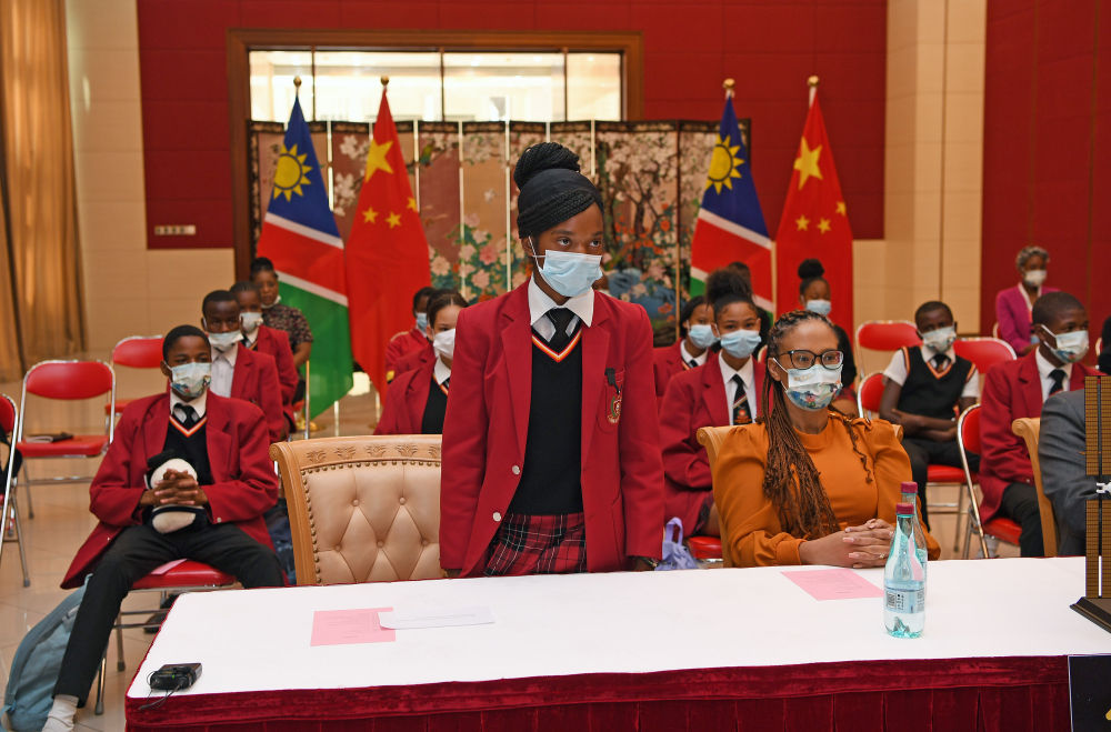↑9月6日,在納米比亞首都溫得和克的“天宮對(duì)話”活動(dòng)納米比亞分會(huì)場(chǎng),一名學(xué)生向中國(guó)航天員提問(wèn)。新華社記者 陳誠(chéng) 攝