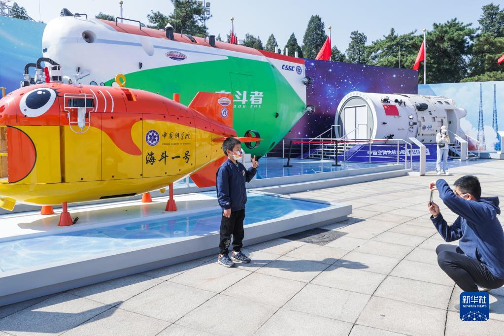10月6日,參觀者在“奮進新時代”主題成就展室外展區“海斗一號”潛水器模型前留影。新華社記者 張玉薇 攝