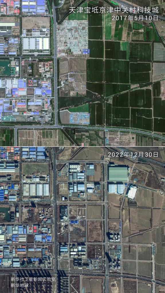 衛星拍攝的天津寶坻京津中關村科技城前后對比圖。