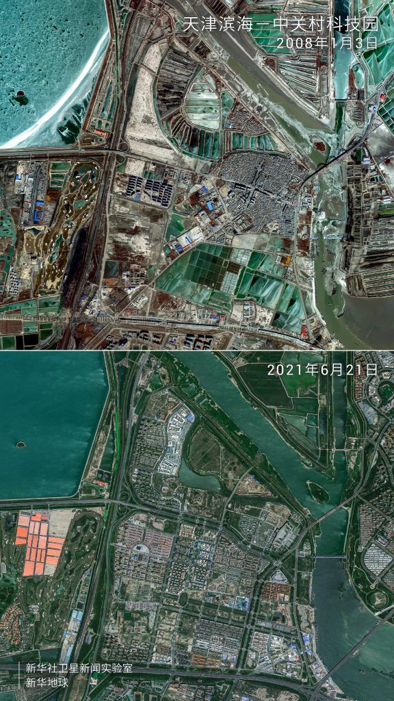 衛星拍攝的天津濱?!嘘P村科技園前后對比圖。