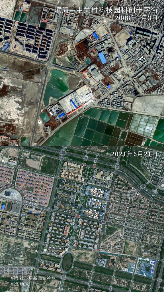 衛星拍攝的天津濱?!嘘P村科技園科創十字街前后對比圖。