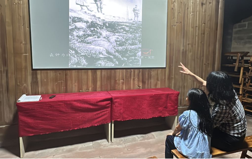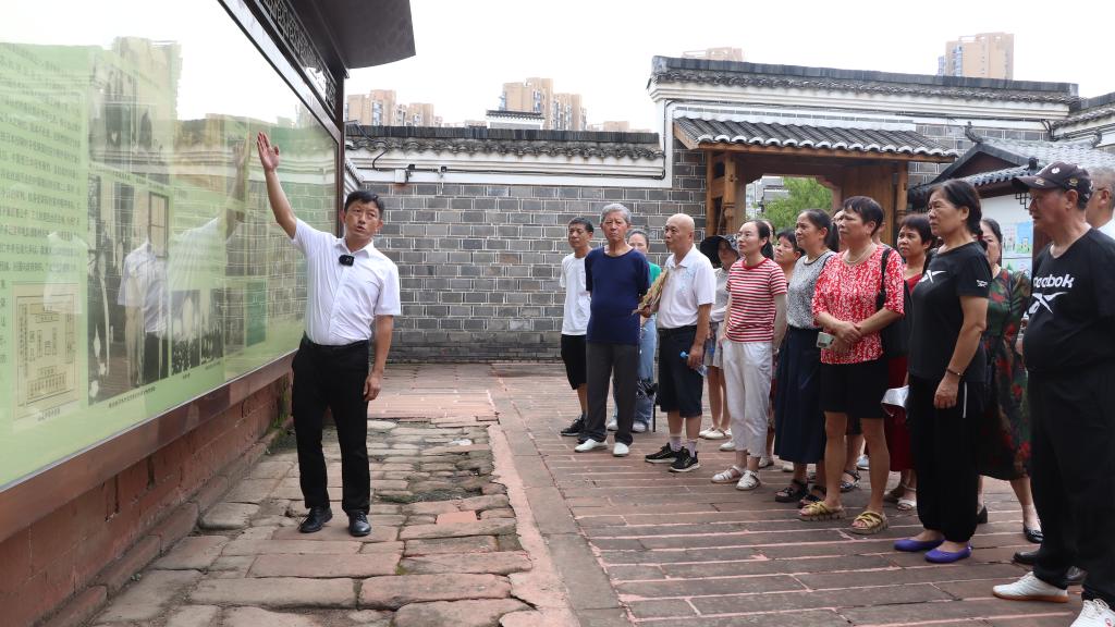 梅庭軍(左一)在遠東國際軍事法庭法官梅汝璈故居為村民和游客進行講解。(梅志剛 攝)