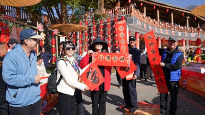 2024年12月30日,游客在乡村年货大集上展示春联。新华社记者 胥冰洁 摄