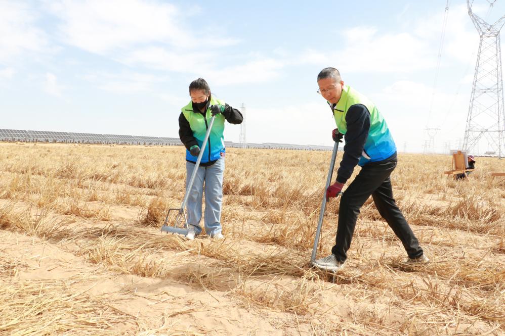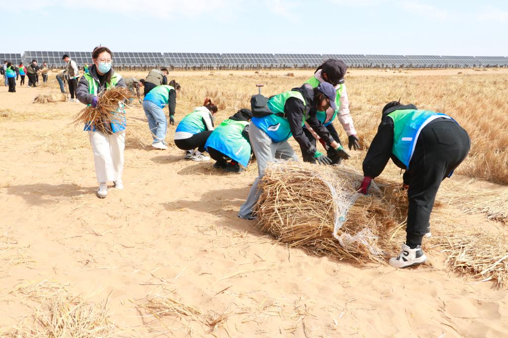 内蒙古自治区巴彦淖尔市磴口县三北治沙青年突击队的成员们正在压制草方格。(受访者供图)