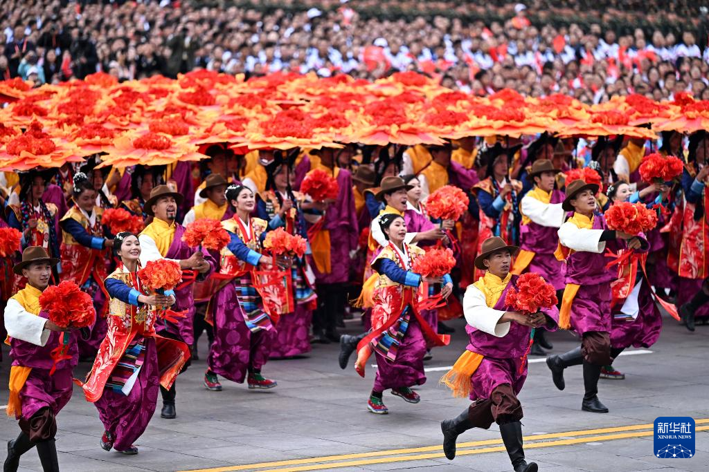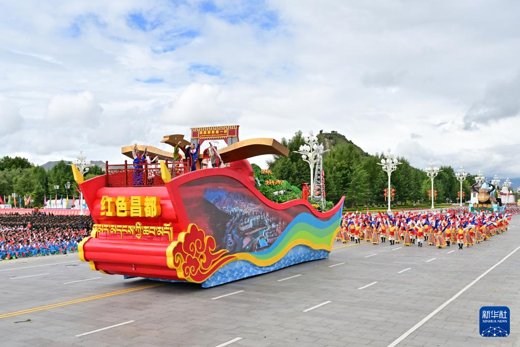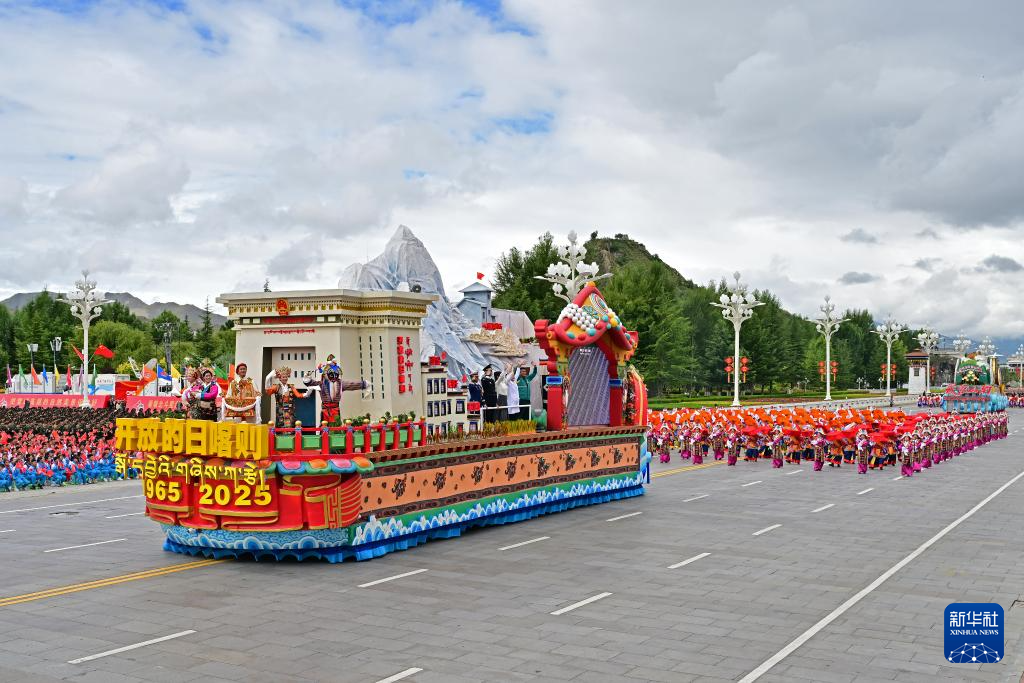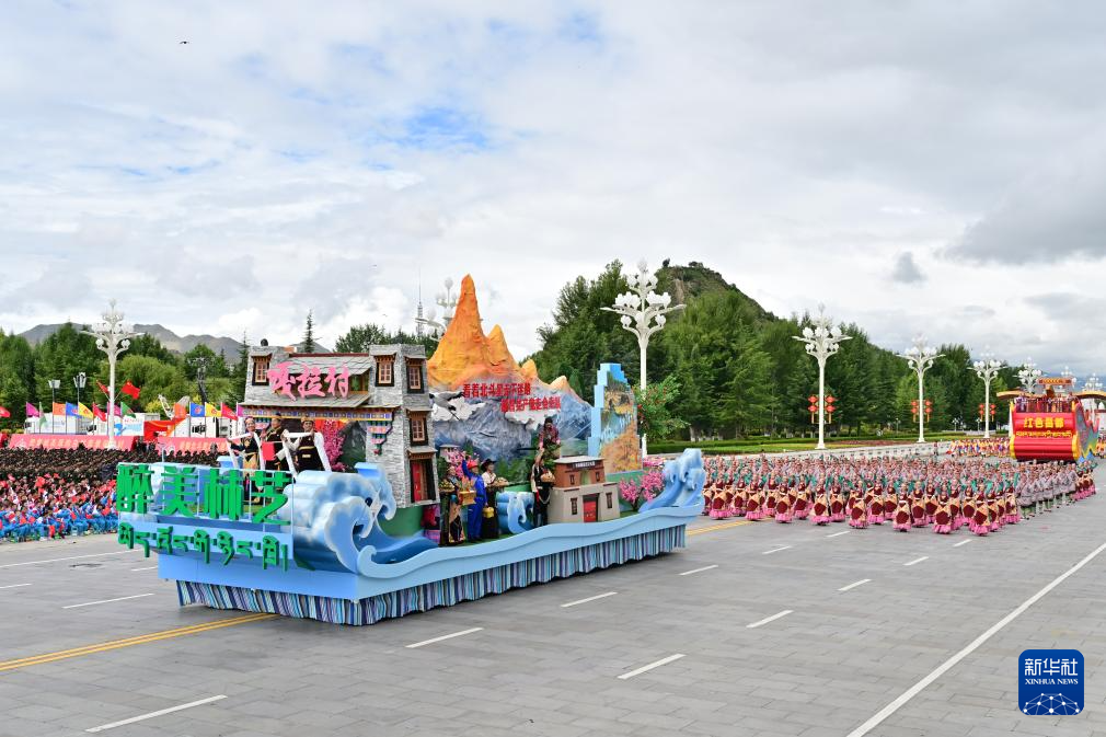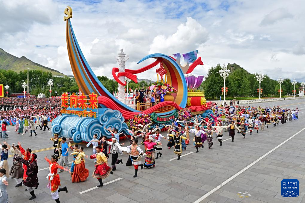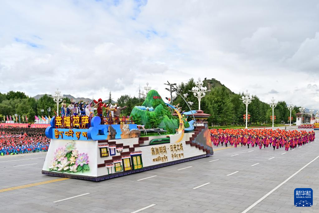 8月21日上午,西藏各族各界干部群众约2万人欢聚拉萨市布达拉宫广场,热烈庆祝西藏自治区成立60周年。这是游行的彩车通过布达拉宫广场。