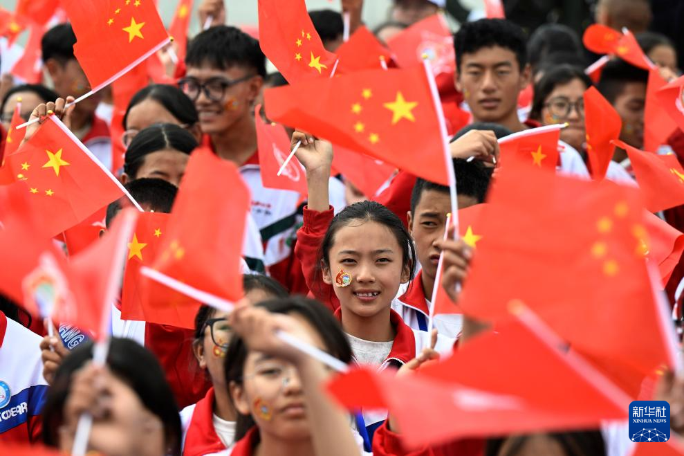 8月21日上午,西藏各族各界干部群众约2万人欢聚拉萨市布达拉宫广场,热烈庆祝西藏自治区成立60周年。这是群众在庆祝大会现场挥舞旗帜。