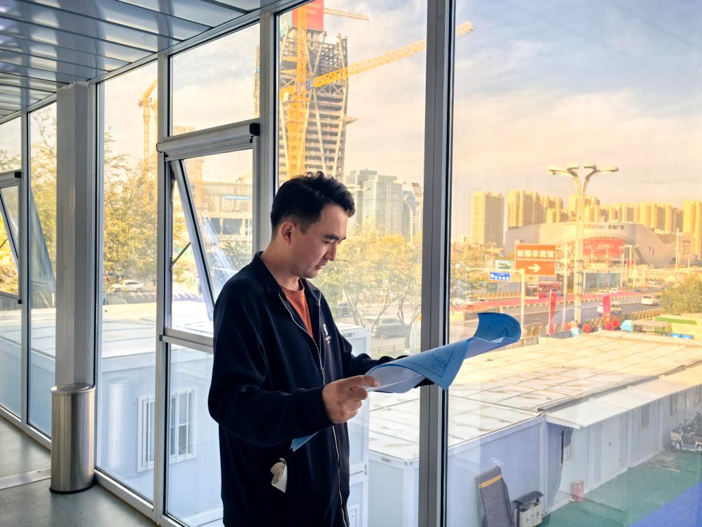9月23日,结构工程师阿合特列克·夏利哈尔在乌鲁木齐华美胜地丽思卡尔顿酒店集群及商旅综合体项目办公区查看图纸。新华社记者 贺小童 摄