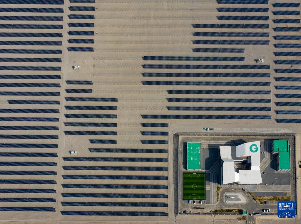 9月22日在新疆巴音郭楞蒙古自治州若羌县拍摄的中国绿发新疆中绿电若羌400万千瓦光伏项目(无人机照片)。该项目每年可发电69.08亿千瓦时,满足南疆200万户家庭用电需求。