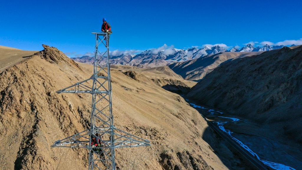 电力工人在新疆塔什库尔干塔吉克自治县的深山中安装用于放线的零件(2019年11月23日摄)。