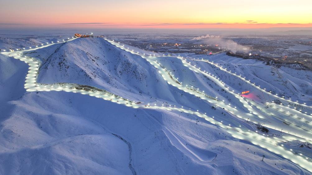 黄昏时分的将军山国际滑雪度假区(2025年1月24日摄)。将军山国际滑雪度假区在夜间开放多条雪道,以满足“雪友”多样化需求。