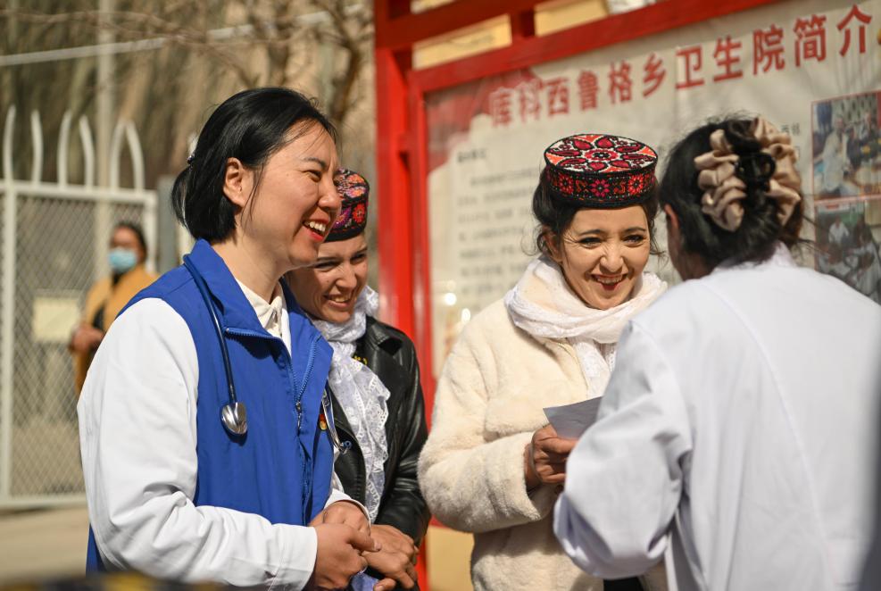 在新疆塔县库科西鲁格乡卫生院,深圳援疆新生儿科医生潘千(左一)与村民、乡卫生院医护人员交流(2025年3月24日摄)。