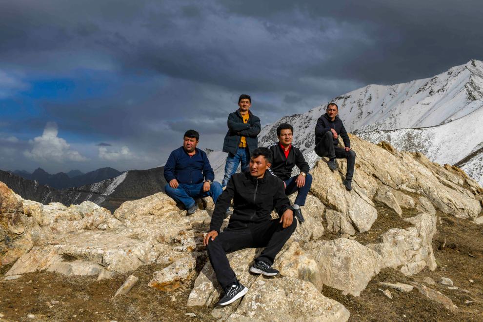 翻越雪山达坂后,参与新疆全民免费体检服务的部分西合休乡卫生院医护人员在山中休息时合影(2020年5月2日摄)。