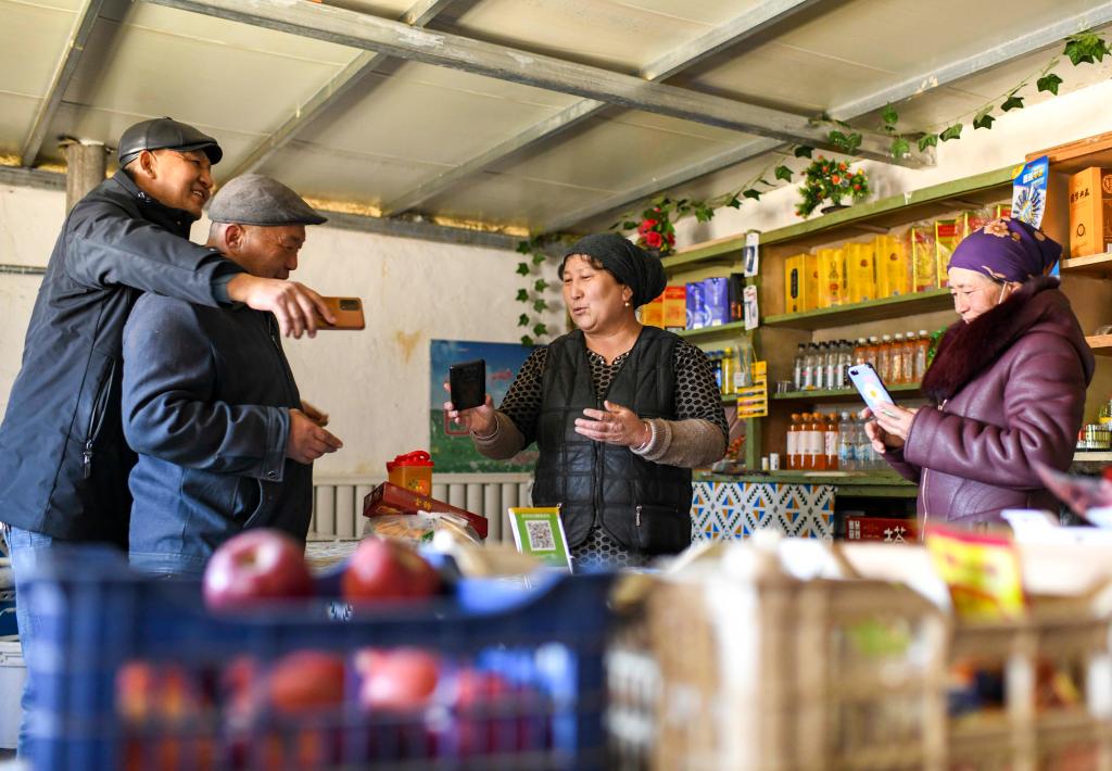周边牧民来到家中买东西,巴哈提(右二)向顾客展示收款到账界面,和大伙儿聊天(2023年2月15日摄)。