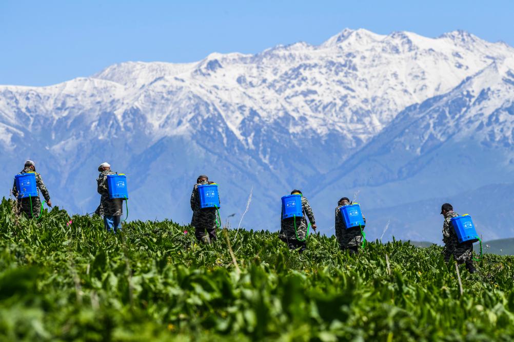 新疆新源县别斯托别乡恰普河加嘠村村民在那拉提草原深处喷洒除毒害草药剂(2018年5月26日摄)。
