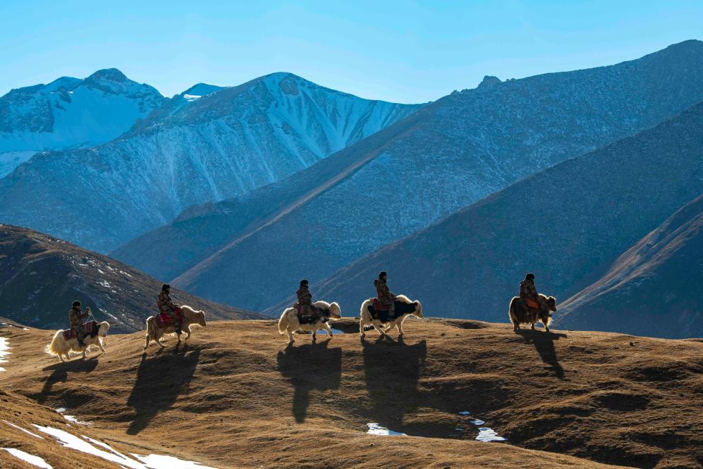 新疆生产建设兵团第三师图木舒克市叶城二牧场三连的干部职工骑着牦牛行进在巡边路上(2020年12月25日摄)。