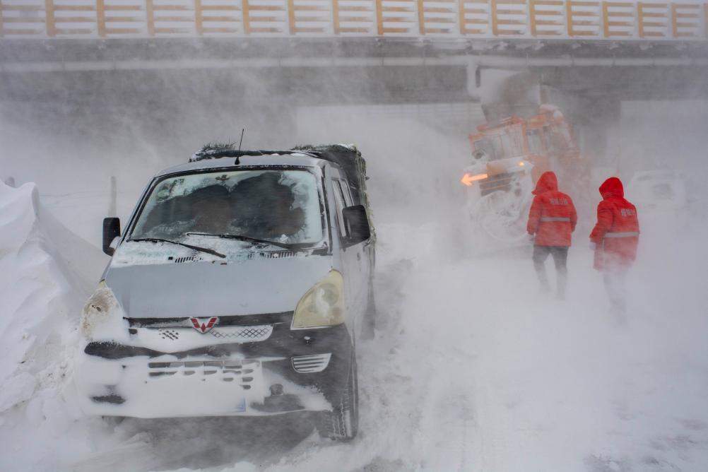 玛依塔斯防风雪抢险基地的工作人员顶风冒雪搜寻被困旅客(2021年1月23日摄)。