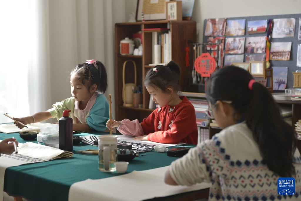 11月2日,孩子们在嘉兴平湖市林埭镇徐家埭村的一家民宿内练习书法。