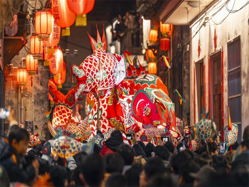 春节期间,游客在安徽歙县北岸镇瞻淇村观赏鱼灯巡游。(歙县北岸镇人民政府供图)