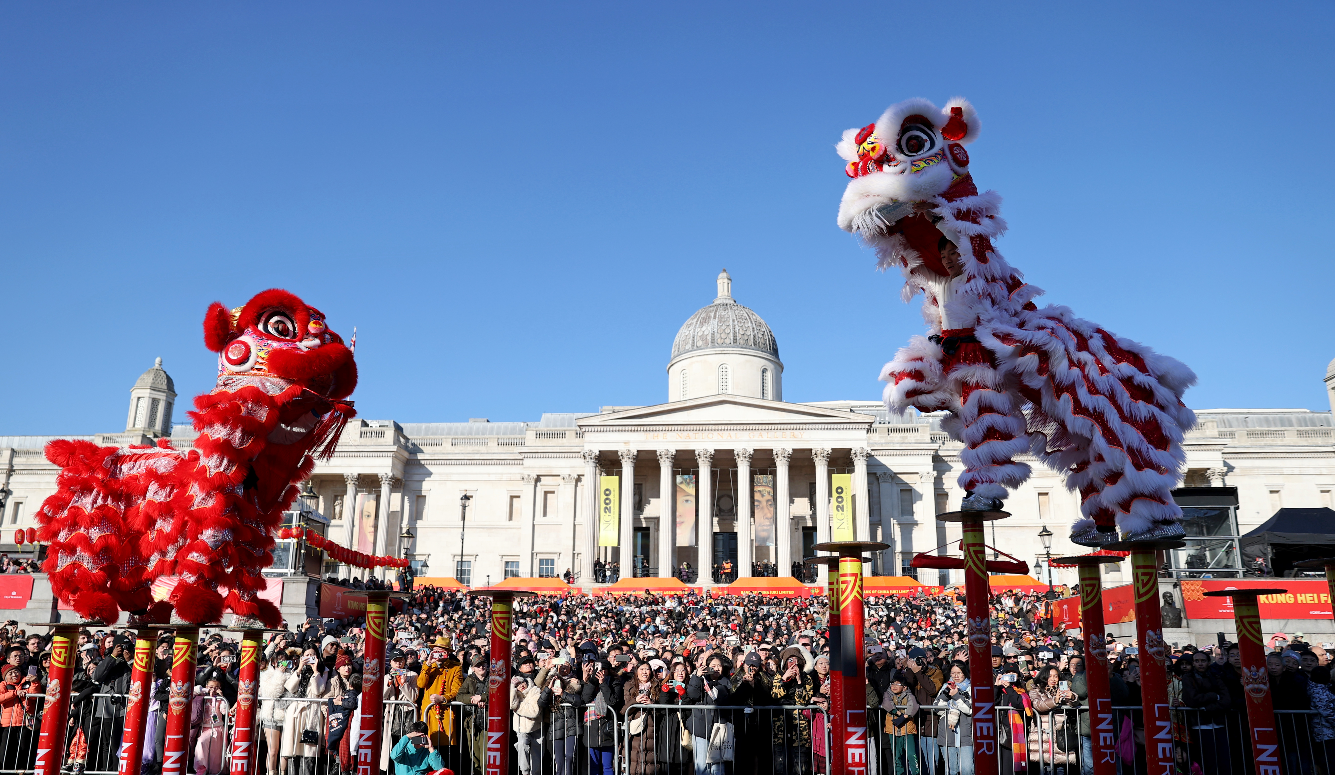 2月2日,在英国伦敦市中心的特拉法加广场,演员表演舞狮。新华社记者 李颖 摄
