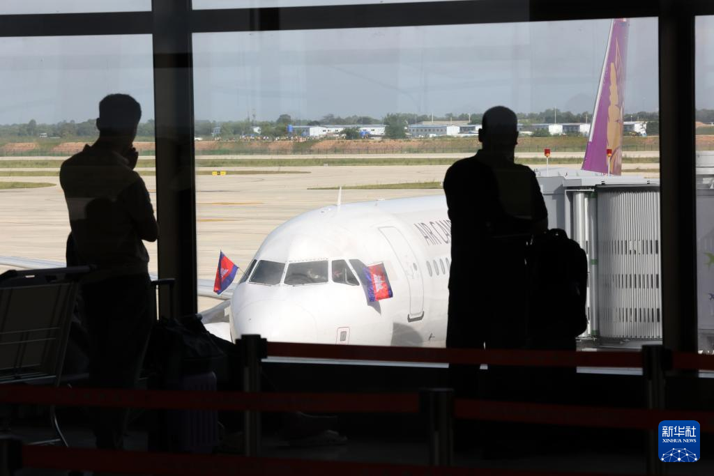 9月9日,在柬埔寨干丹省,乘客在德崇国际机场的候机楼内观看客机停靠。新华社发(索万纳拉摄)