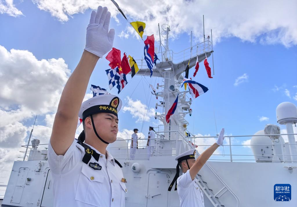10月13日,执行“和谐使命-2025”任务的中国海军“丝路方舟”号医院船抵达汤加努库阿洛法港。这是医院船官兵向欢迎人群挥手。新华社发(崔晓洋 摄)