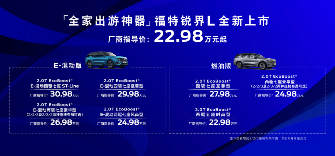 在今天的福特Live Show上,还公布了锐界L的官方厂商指导价——燃油版22.98万元至27.98万元,E-混动版24.98万元至30.98万元。