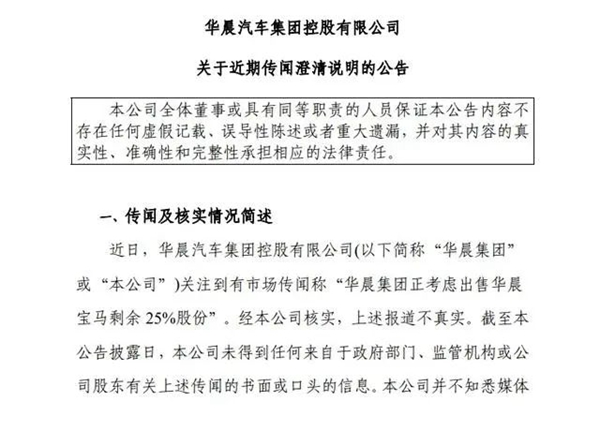 日前,华晨汽车集团控股有限公司(以下简称“华晨集团”)发布公告称:近日,华晨集团关注到市场传闻称“华晨集团正考虑出售华晨宝马剩余25%股份”。经公司核实,上述报道不真实。截至公告披露日,公司未得到任何来自于政府部门、监管机构或公司股东有关上述传闻的书面或口头的信息。公司并不知悉媒体报道所载资料的来源。为避免对投资者构成误导,现予以澄清说明。