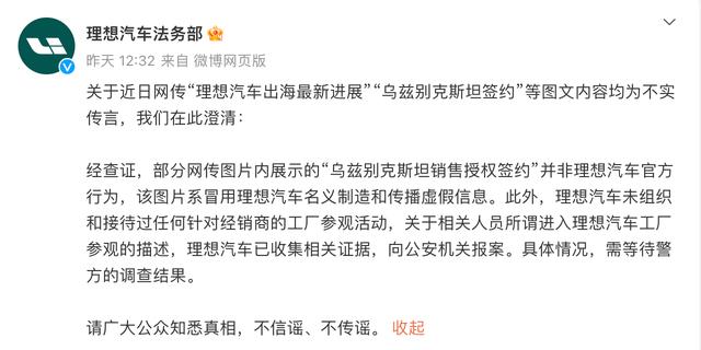 理想汽车方面表示,经查证,部分网传图片内展示的“乌兹别克斯坦销售授权签约”并非理想汽车官方行为,该图片系冒用理想汽车名义制造和传播虚假信息。此外,理想汽车未组织和接待过任何针对经销商的工厂参观活动,关于相关人员所谓进入理想汽车工厂参观的描述,理想汽车已收集相关证据,向公安机关报案。具体情况,需等待警方的调查结果。(记者 吴遇利)