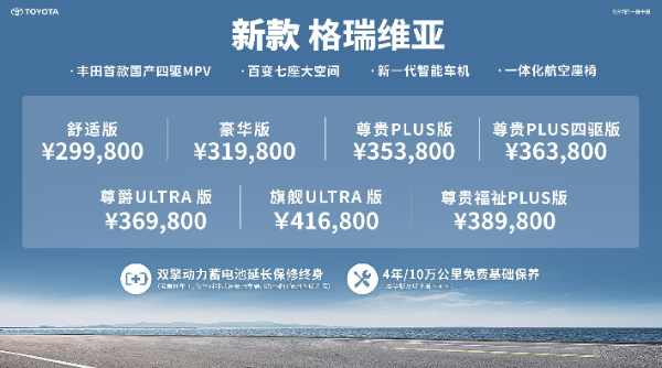 4月18日,丰田首款国产四驱MPV--新款格瑞维亚正式上市,新车共发布7款车型,售价为29.98万元-41.68万元。其中,尊贵PLUS版在现款基础上不仅再降3000元,还增加了价值万元的智能配置,包括最新一代车机系统,人性化的HUD抬头显示功能、12.3英寸全液晶仪表盘,并可以选装一体化航空座椅。尊贵PLUS四驱版售价仅比尊贵PLUS版上浮一万元,满足了用户既追求平稳舒适,又注重品质出行的诉求。此外,舒适版定价更是比现款车型售价直降1.6万元,首次进入30万元价格区间。