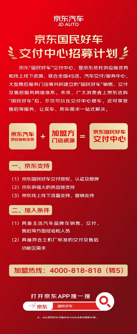 目前,京东“国民好车”交付中心和京东养车“一县一店”合伙人招募均已正式开启,有意向的合作伙伴可拨打4000-818-818(转5)加盟专线了解详情。随着更多“国民好车”车型的陆续公布与服务网络的持续完善,京东汽车将携手伙伴,让更多用户感受到“买车养车来京东,省钱又省心”的一站式汽车消费新体验。