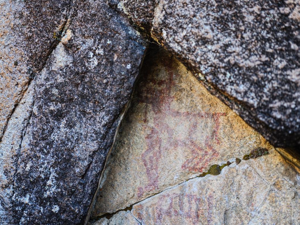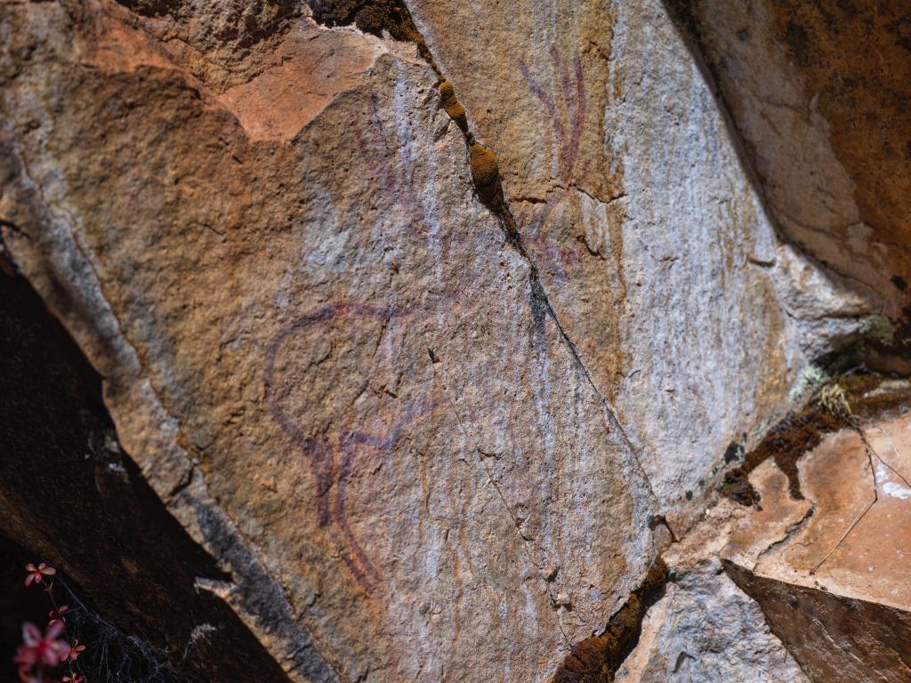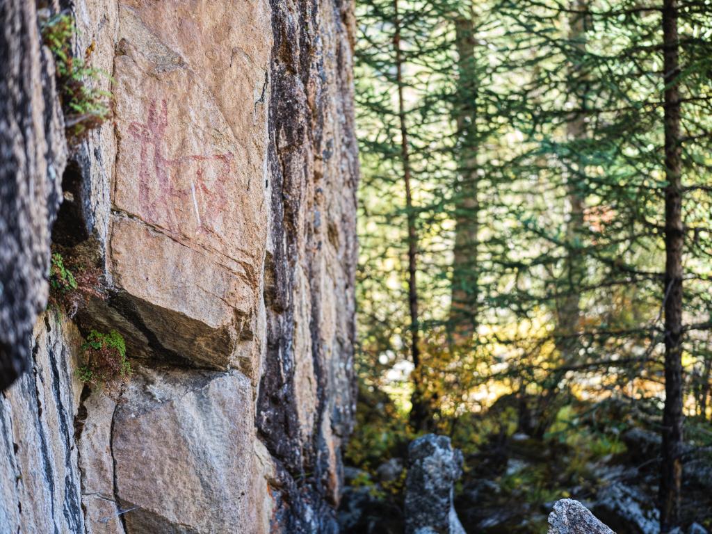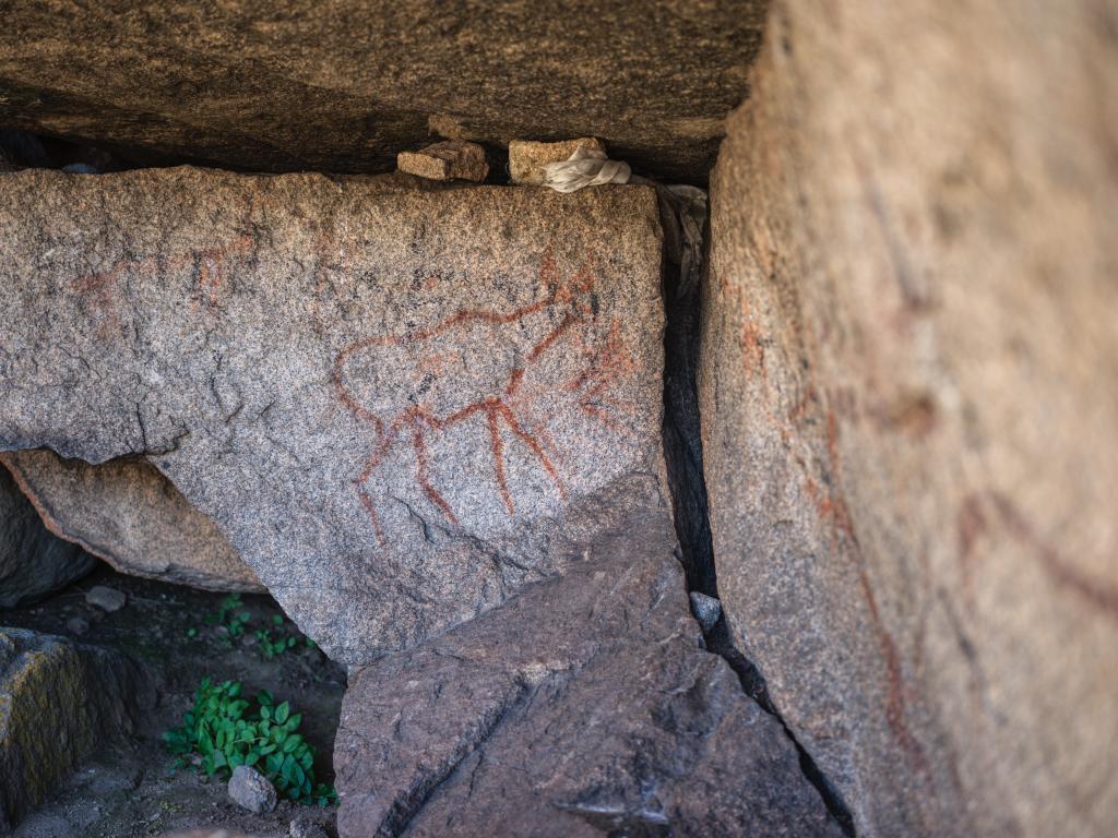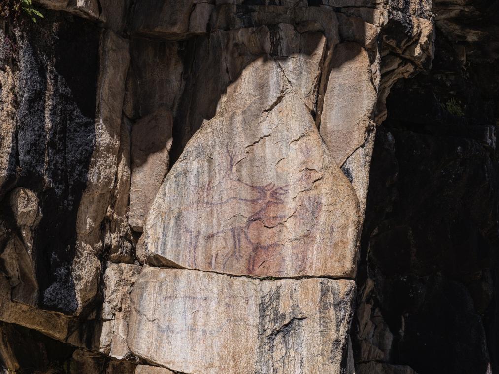 10月21日拍摄的久乃岩画。该岩画由红颜料涂绘的十余幅鹿形图像和若干抽象图案组成。