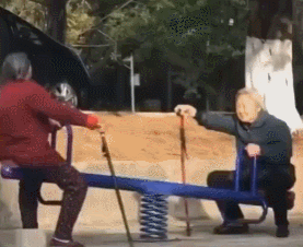 老了,我们依然是朋友。校园广场上,两位老奶奶一边拄着拐杖一边玩起了跷跷板,她们的笑声回荡在校园里。这一刻她们就像两个开心的孩子。