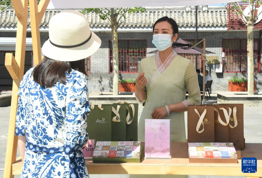 7月7日,在北京市平谷区刘家店镇丫髻山景区,工作人员(右)向游客介绍桃花普洱茶。
