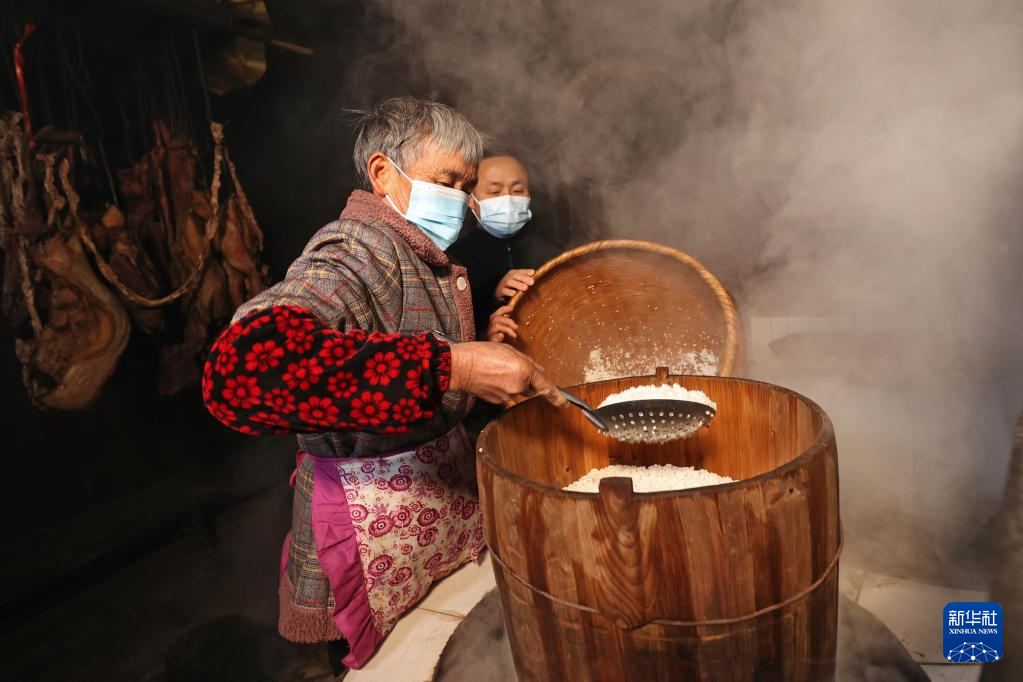 12月27日,岑巩县水尾镇马家寨村村民将泡好的糯米放入甑子蒸煮。
