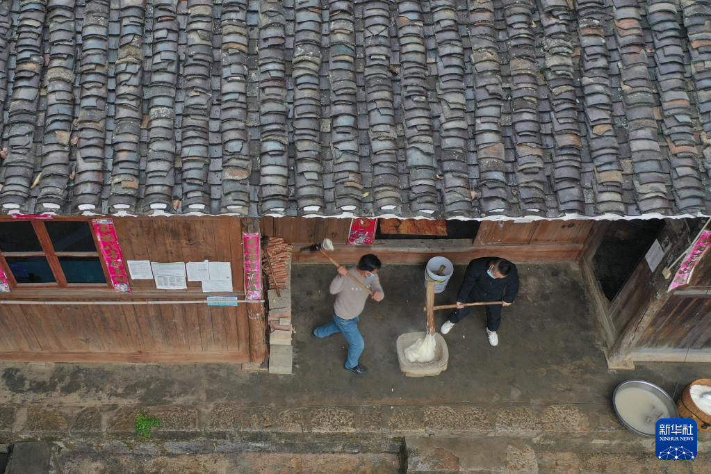 12月27日,岑巩县水尾镇马家寨村村民将糯米捣成糯米糍粑(无人机照片)。