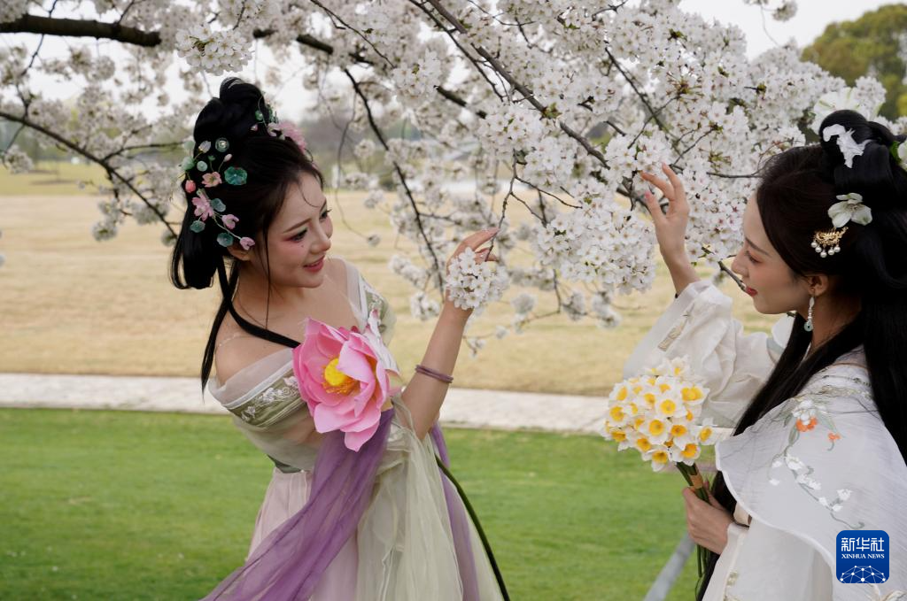 3月30日,在辰山植物园的“城市美育日”活动现场,两名装扮成“花神”的女子在游览“辰山花会”。