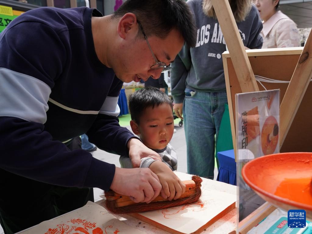 3月30日,在徐泾镇万科天空之城的青浦区“城市美育日”主会场,小朋友和爸爸在“美育市集”上一起体验雕版印刷。
