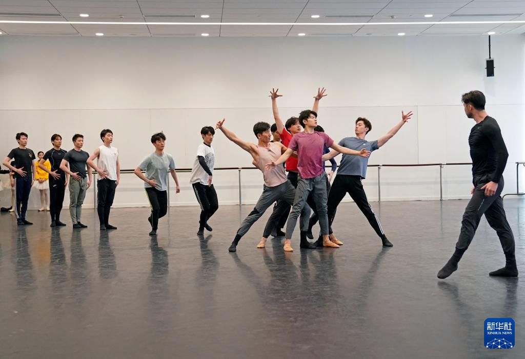 4月9日,作为《大地之光》的编导,上海芭蕾舞团副团长、首席主要演员吴虎生(前左)在指导演员排练。