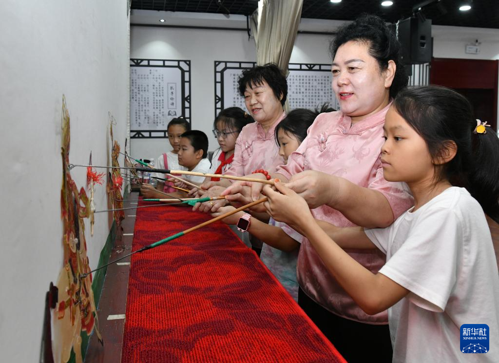7月26日,在河间市第一实验小学,皮影戏艺人在指导小学生学习皮影戏。