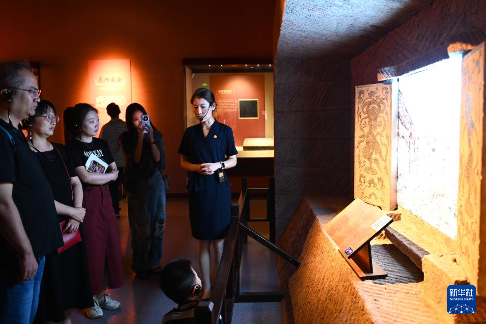 9月1日,游客在宁夏博物馆观赏石刻胡旋舞墓门。