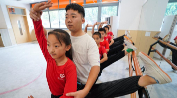 小昆班专职老师周杰在石牌中心小学校训练房内指导学员训练(9月6日摄)。