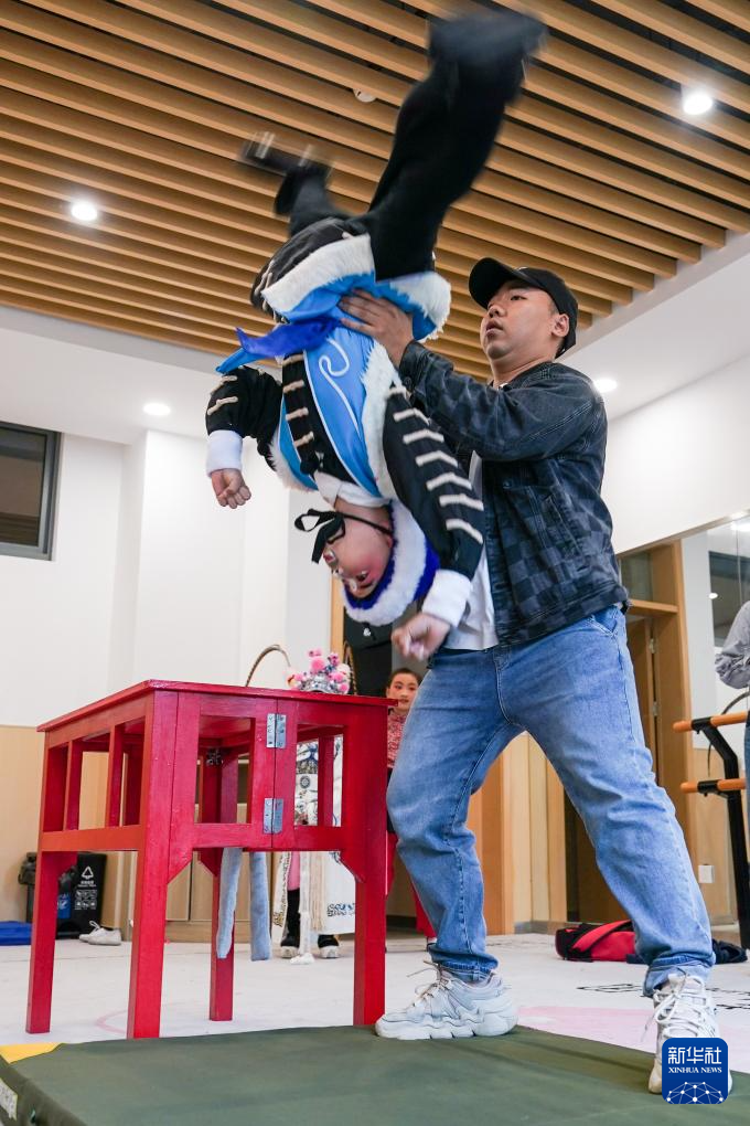 小昆班专职老师周杰(上)在指导解苏倩(下)进行昆曲剧目专项表演训练(5月26日摄)。